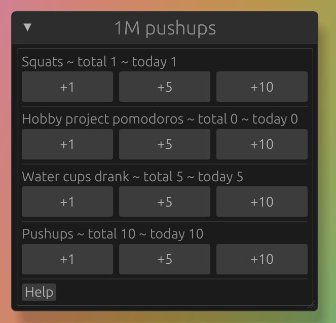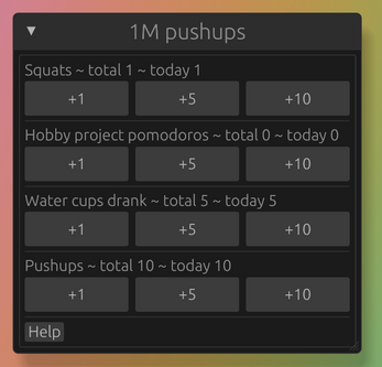 "Tracker": This is a habit tracking tool where you can easily record your progress towards life goals. The total number of good things you've done in your life never goes down! (There is no cloud save! Data stays in your browser.)